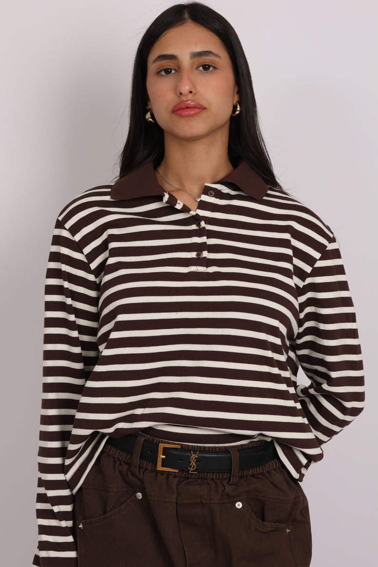 חולצה קלאסית עם פסים בגווני חום ולבן עשויה מבד נעים ואיכותי כוללת צווארון פולו מוקפד עם סגירת כפתורים