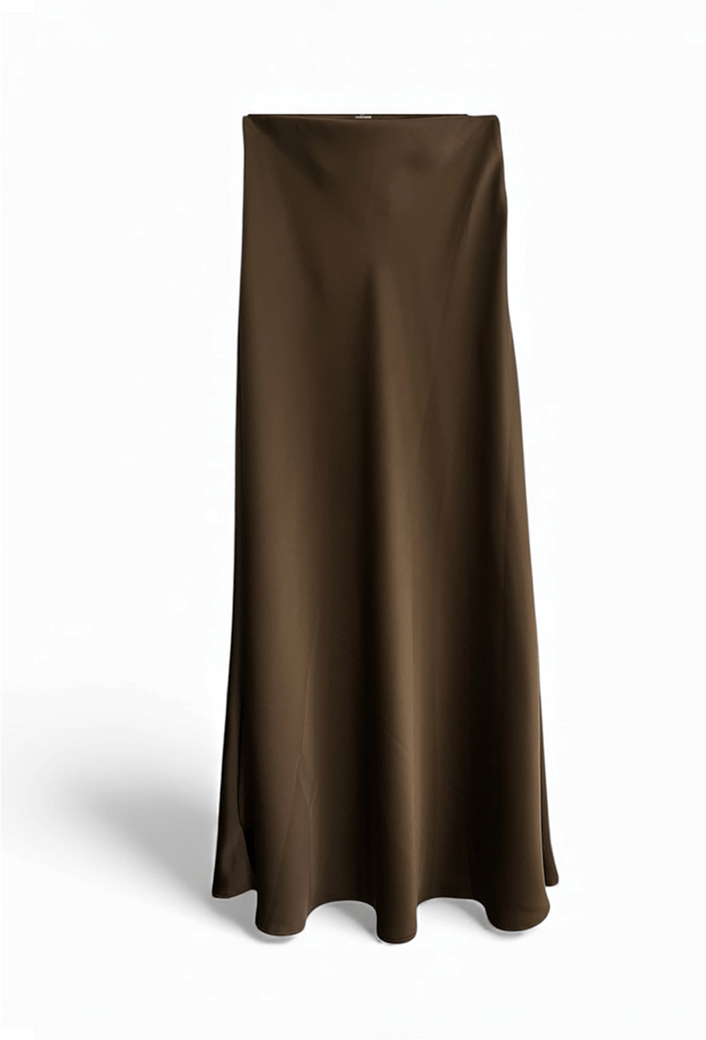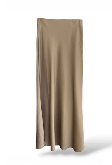 חצאית סאטן עם גומי במותן ורוכסן צדדי, בעלת גזרה ישרה, אורך מידי ומראה חלק